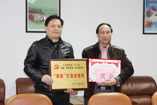 市委常委組織部部長(zhǎng)葉銳箭向集團(tuán)黨委書(shū)記張解矛頒發(fā)“廣東省‘兩新’百?gòu)?qiáng)黨組織”牌匾