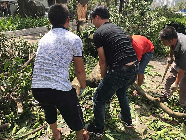 2017年8月23日中午12點50分,第13號臺風“天鴿”正面襲擊珠海市,大批樹木被攔腰折斷或連根拔起,造成大部分主干道堵塞,嚴重影響當?shù)鼐用窆ぷ骱蜕??!疤鞛臒o情人有情”,我集團珠海公司在獲悉災情后,迅速行動,組織人員和車輛,全力以赴針對突出的受阻道路進行清理工作。在安平路、桃園路、海虹路、東風路等路段,隨處可見殘樹斷枝錯亂橫陳,珠海公司員工與當?shù)鼐用褚黄鹎鍜呃?,搬移樹木。直到該路段清障工作完成,道路交通基本恢復?/font>