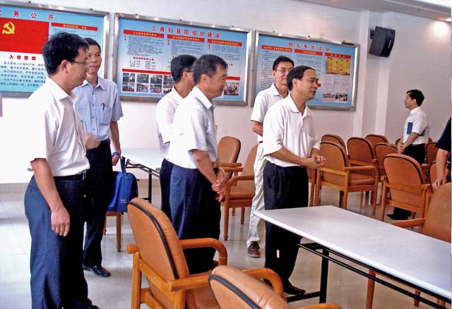朱書記一行先參觀我司“創(chuàng)先爭(zhēng)優(yōu)宣傳欄” 及“黨工青婦活動(dòng)之家”, 并詳細(xì)觀察“公開欄” 及活動(dòng)照片,圖片說明,雜志架、圖書柜等;跟著到我司開發(fā)、施工、管理的“天富豪庭” 小區(qū)參觀考察,最后到我司技術(shù)中心大樓五樓會(huì)議室與我司董事局主席周珉興及公司黨工青婦各組織領(lǐng)導(dǎo)一起座談,公司黨委書記張解矛先匯報(bào)“統(tǒng)籌黨工青婦基層組織‘五好’ 建設(shè)” 及“創(chuàng)先爭(zhēng)優(yōu)” 的工作情況,跟著工、青、婦等領(lǐng)導(dǎo)也一一匯報(bào),續(xù)后考察組一行又詳細(xì)詢問并與我司人員探討存在問題與熱點(diǎn)。